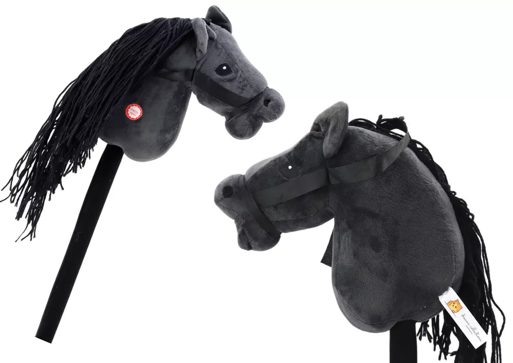 Pliušinis arkliuko galvos žaislas ant lazdelės, ilgaplaukis arklys, juodas, su garsais