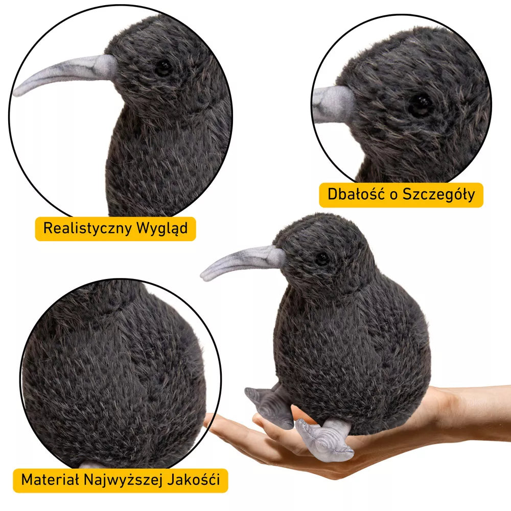 Pliušinis kivio paukščio talismanas, 21 cm aukščio, tiksliai atspindintis būdingą šio unikalaus paukščio juodą plunksną. Pagamintas iš itin minkštos ir malonios liesti medžiagos, suteikia išskirtinį komfortą glostant. Kruopščiai ištobulintos detalės suteikia jam autentišką išvaizdą, todėl jis yra idealus žaidimų draugas ir vaiko kambario dekoracija.
