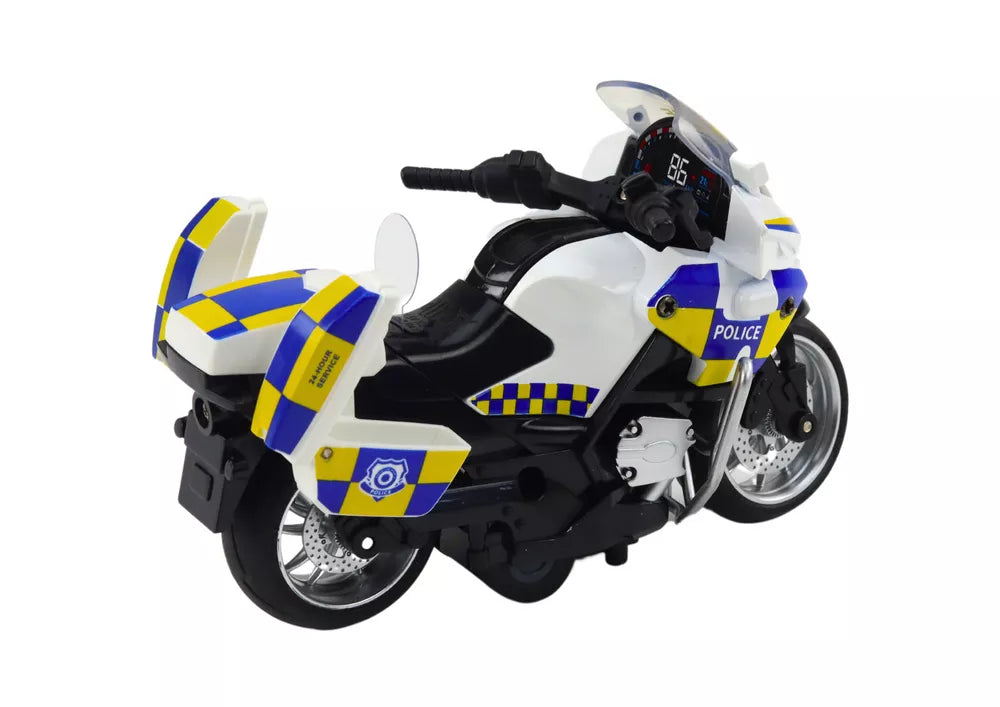 Policijos motociklas su trinties pavara, maitinamas baterijomis, šviečia ir skleidžia garsus
