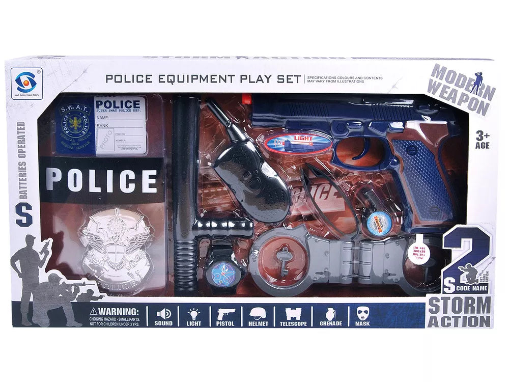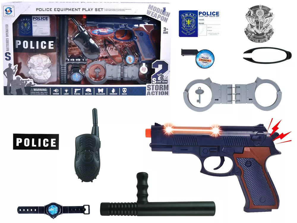 Rinkinyje yra pistoletas su šviesos ir garso efektais, kuris suteikia realumo žaidimo metu, taip pat platus policijos reikmenų pasirinkimas, pvz., ženklelis, racija, lazda ar apsauginis skydas, leidžiantis susikurti savo intervencijos scenarijus. Dėl aukštos kokybės apdirbimo iš patvaraus plastiko, visi elementai yra atsparūs intensyviam žaidimui ir užtikrins ilgas pramogų valandas.