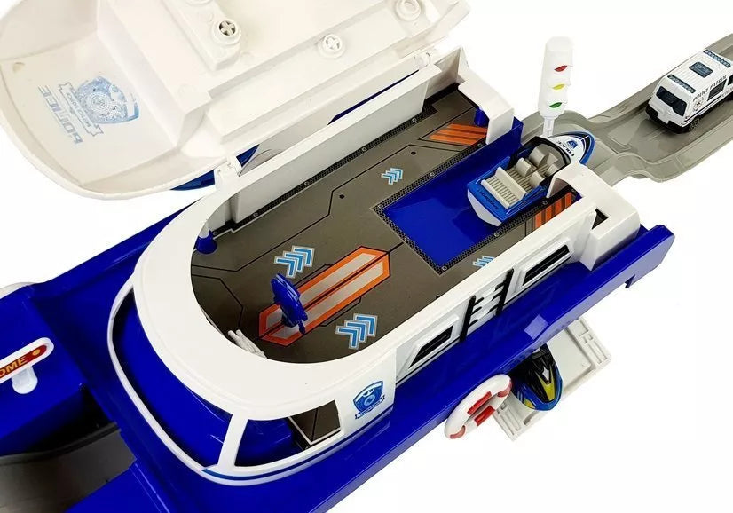 Baltos ir mėlynos spalvos laivas su policijos lipdukais. Šonuose yra gelbėjimo ratai, kurie suteikia tikroviškumo. Žaislas juda ant ratukų, pritvirtintų prie apačios. Be to, pridedami automobiliai yra vienas iš pagrindinių dalykų. Juos galima transportuoti laive viršutinėje ir apatinėje dalyse. Viršutinė laivo dalis atidaroma, o dėl pritvirtintos rampos automobiliai gali lengvai įvažiuoti į laivą, įvažiuodami iš galinės laivo pusės. Valdymo bokštas siunčia policijai garso ir šviesos signalus.