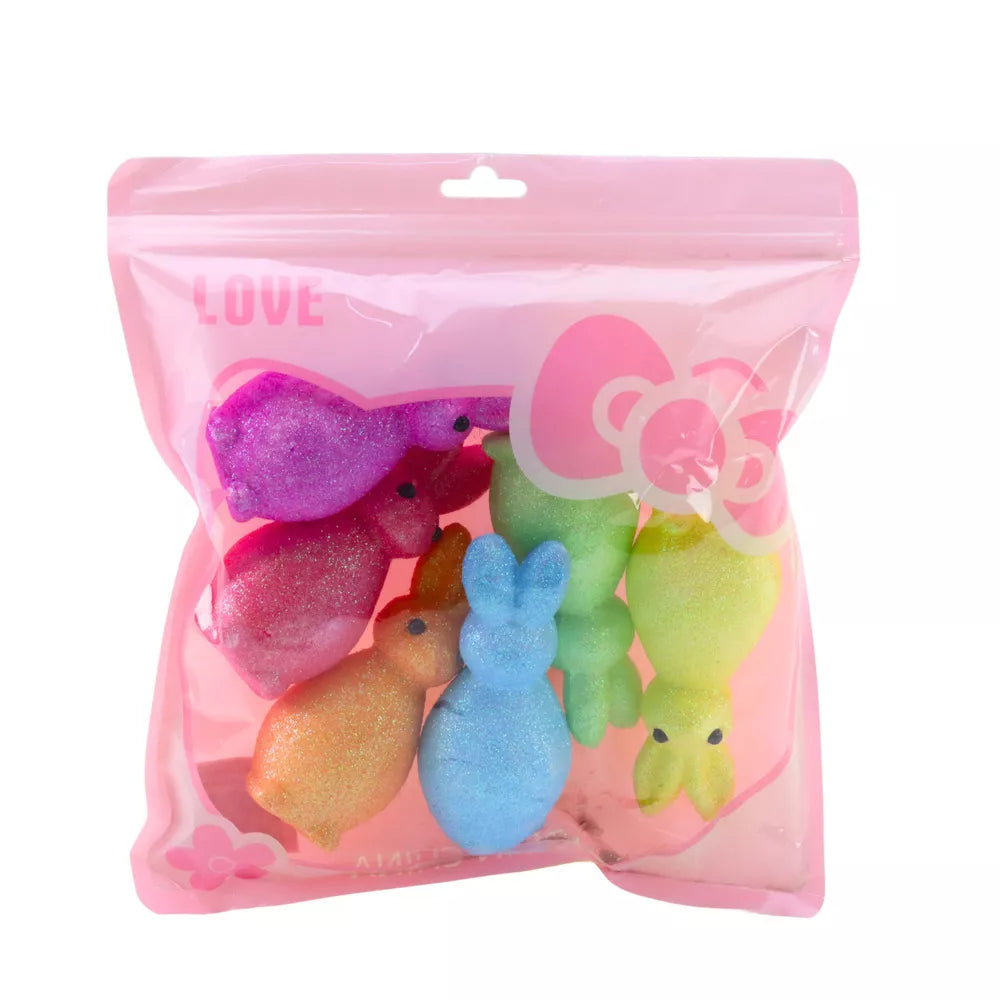 6 putplasčio kiškučiai, padengti blizgučiais (geltonas, mėlynas, rožinis, žalias, oranžinis, violetinis)
