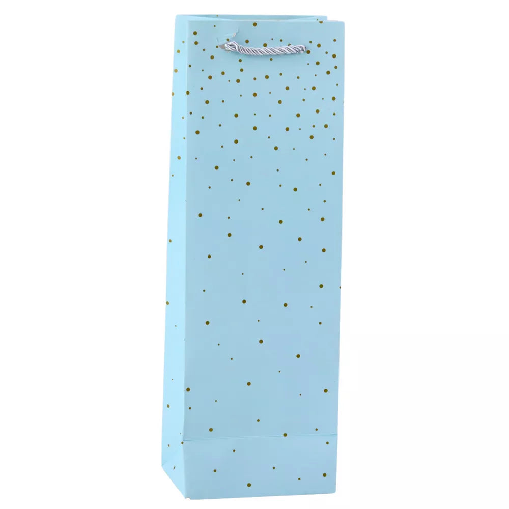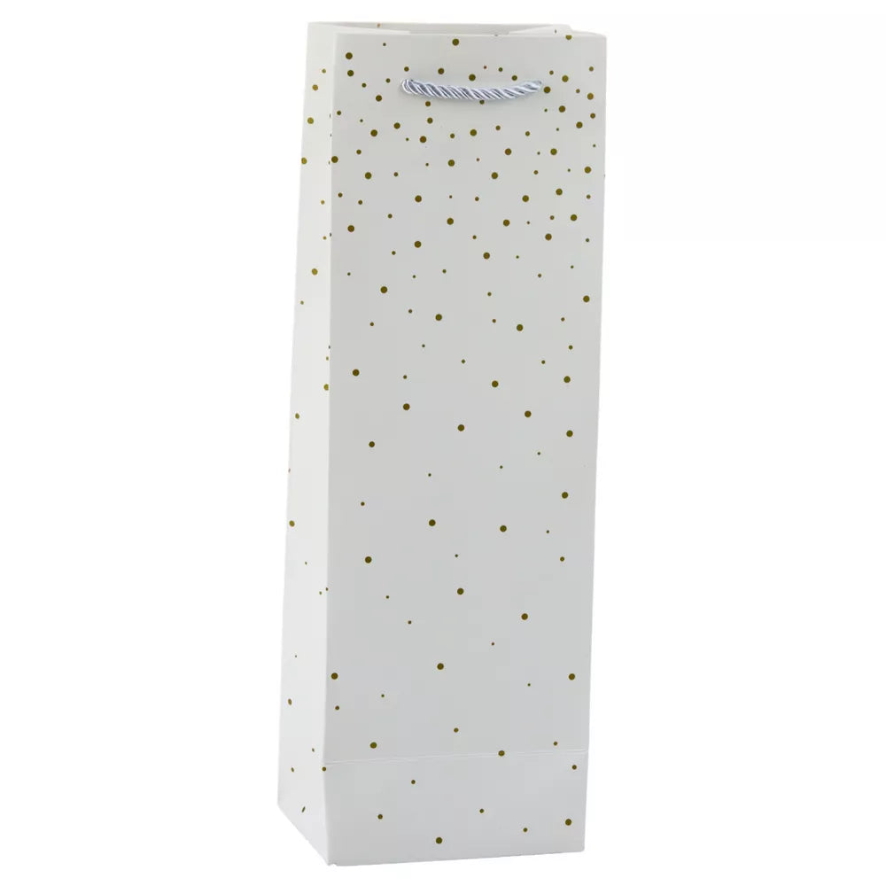 Elegantiškas dovanų maišelis buteliui – puikus būdas efektyviai supakuoti alkoholį ar kitus gėrimus bet kokiai progai. Pagamintas iš aukštos kokybės popieriaus, maišelis išsiskiria minimalistiniu, tačiau prabangiu dizainu. Jis padengtas subtiliu raštu mažų, auksinių taškelių pavidalu, kurie suteikia jam elegancijos ir prašmatnumo.