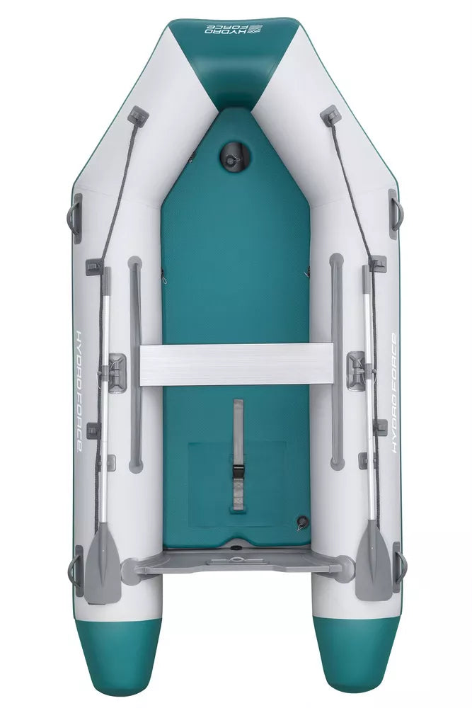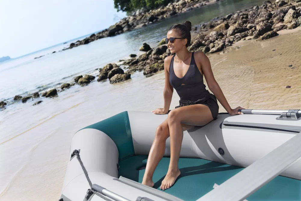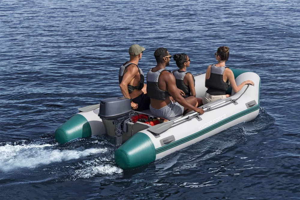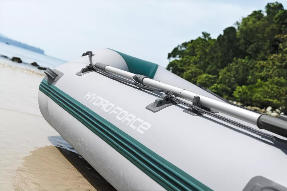 Išvyka prie vandens yra puikus būdas praleisti laisvalaikį su artimaisiais. Norėdami paįvairinti šį nerūpestingą laiką, apsirūpinkite papildomais baseino priedais. 4 vietų pripučiama sportinė valtis puikiai tinka žvejybai ar plaukiojimui atvirame vandenyje. Ji pagaminta iš itin patvarios, didelio tankio, saulei atsparios medžiagos – trijų sluoksnių sustiprintos medžiagos su poliesterio tinkleliu, padengtu patvariais PVC sluoksniais, kad būtų lengva ir tvirta. Jūrinės faneros skersinis su variklio laikikliu gali išlaikyti variklį (variklis nepridedamas). Grindys yra tokios pat tvirtos ir patogios kaip tradicinės valties, tačiau lengvos ir atsparios oro sąlygoms. Konstrukcija su 3 oro kameromis suteikia šiai valčiai puikų balansą vandenyje ir neleidžia valčiai greitai apvirsti vienu pradūrimu. Prie valties priekio pritvirtintas plieninis vilkimo žiedas, skirtas vilkimui ir tvirtinimui. Apsauginės virvės leidžia manevruoti valtimi iš valties arba iš vandens ant denio. Į šį rinkinį įeina pora dviejų dalių aliumininių irklų, kuriuos galima įstatyti į irklų laikiklius, kad būtų galima efektyviai naršyti.