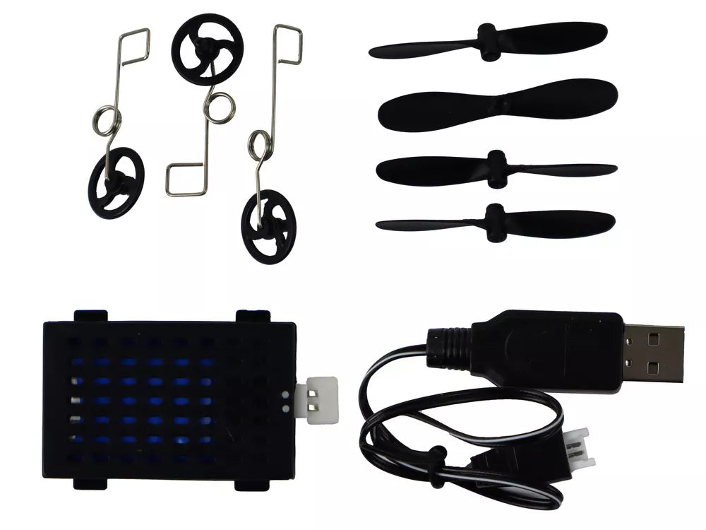 Žaisle yra baterija su USB įkrovikliu, taip pat keturi keičiami sraigtai, trys ratai ir patogus nuotolinio valdymo pultas. 2.4G technologijos dėka įmanomas sklandus ryšys iki 120 metrų atstumu.