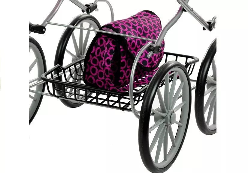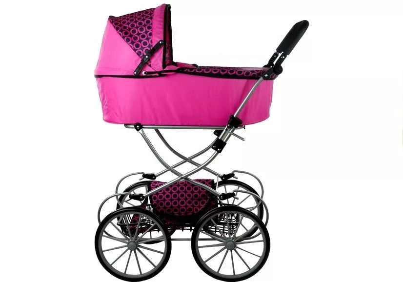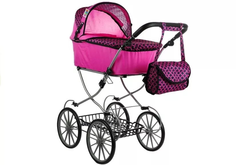 Intensyviai rožinis Retro Dolls vežimėlis iš dalies dekoruotas juodais apskritimais. Jis puikiai tinka visoms vyresnėms nei 3 metų mergaitėms, kurios nori tinkamai pasirūpinti savo lėlėmis. Retro Dolls vežimėlis puikiai tinka visiems žaislams, kurių apytikslis ilgis yra 69 cm.
