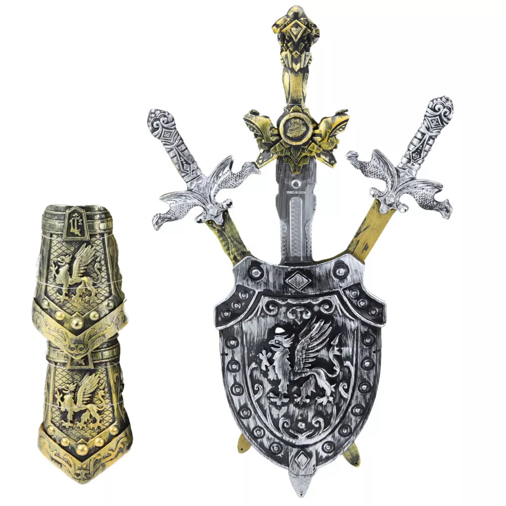 Į rinkinį įeina trys kalavijai, įskaitant vieną didesnį – pagrindinį vado kalaviją, dekoratyvinis skydas su erelio motyvu, taip pat dvi rankų apsaugos, imituojančios riterio šarvus. Visa tai sukurta atsižvelgiant į detales – kalavijai turi stilizuotas rankenas, o skydas papuoštas reljefiniu herbu, kuris pabrėžia jo unikalų charakterį.