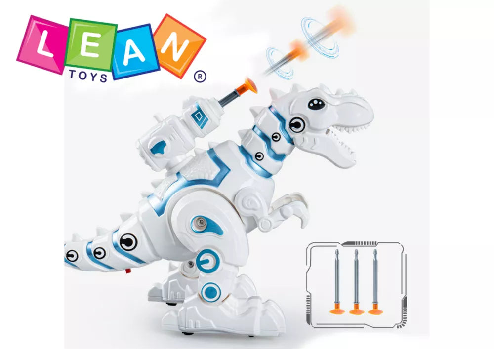 Robotas dinozauras su strėlyčių paleidimo įrenginiu, šviesomis ir garsais, baltas