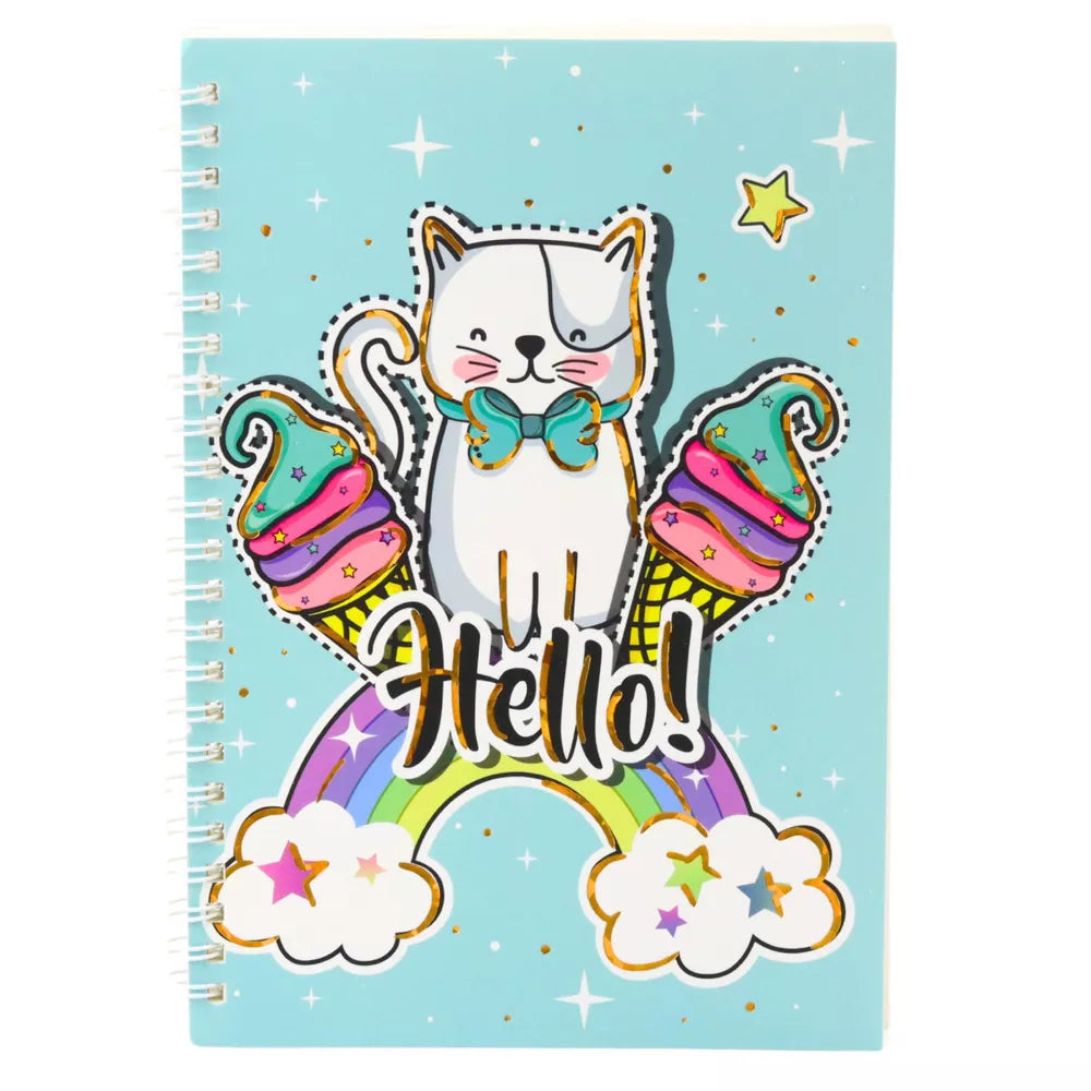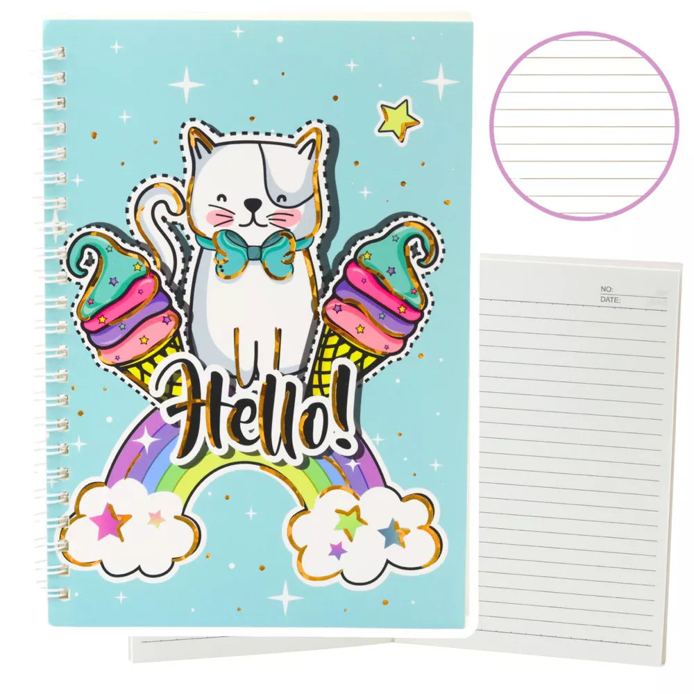 Sąsiuvinis A5, linijuotas, 60 lapų, su katės, vienaragio, ledų, vaivorykštės motyvais, turkio spalvos