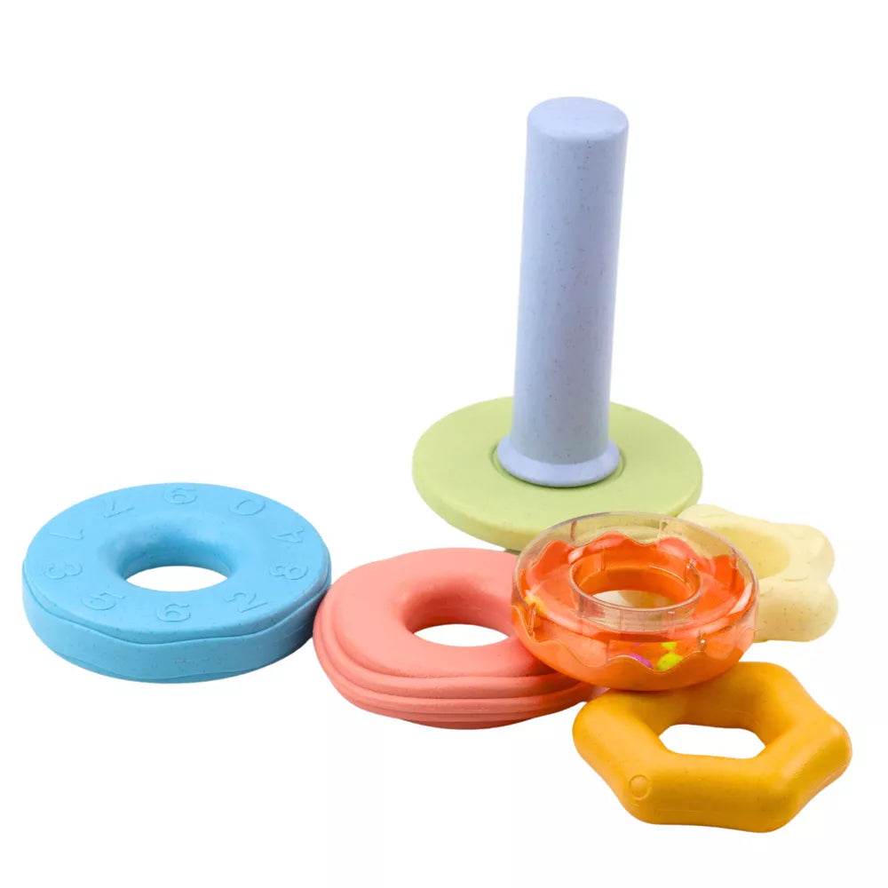 Spalvotų apskritimų bokštas yra edukacinis sensorinis žaislas, palaikantis visapusišką vaiko vystymąsi nuo pat mažens. Jo švelnios, pastelinės spalvos kartu su įvairiomis formomis ir paviršiaus struktūromis stimuliuoja regos ir lytėjimo pojūčius ir tuo pačiu skatina tyrinėjimą bei žaidimą. Žaidimas apima žiedų uždėjimą ant centrinės kolonos, o tai yra puikus pratimas smulkiosios motorikos, rankų ir akių koordinacijos bei loginio mąstymo įgūdžiams lavinti.