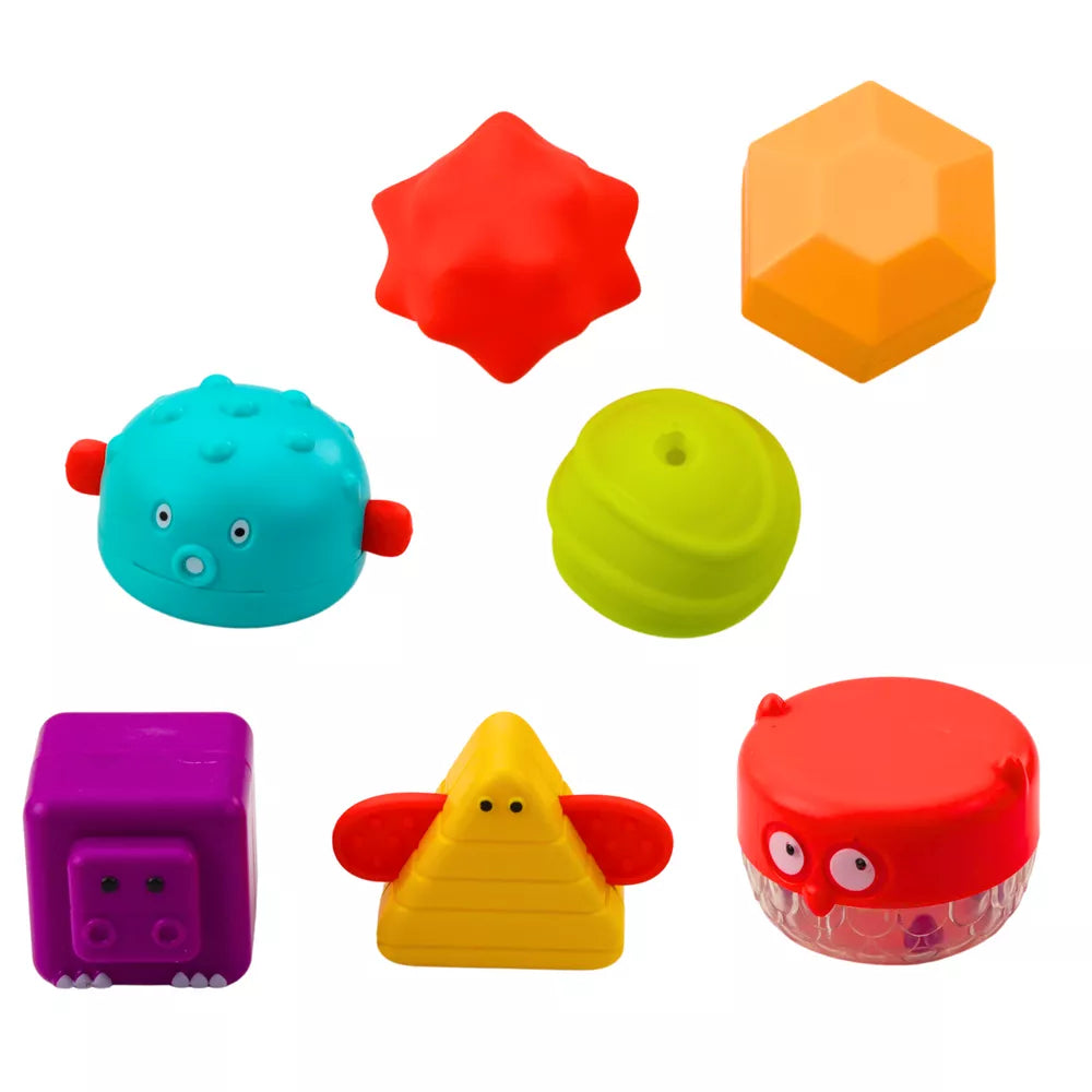 Rinkinį sudaro 7 skirtingų formų kaladėlės - kiekviena iš jų turi unikalią spalvą, tekstūrą ar grafiką, leidžiančią lavinti vaiko lytėjimo ir regėjimo suvokimą. Žaislas pagamintas iš patvarių, saugių medžiagų ir neturi aštrių briaunų.