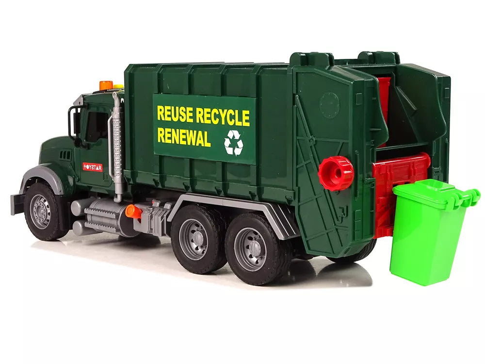 Papildomos funkcijos, tokios kaip garso ir šviesos efektai, suteikia efekto ir tikroviškumo visai pramogai. Įspėjamieji signalai viršuje informuoja apie judėjimą, mygtukas viršuje yra atsakingas už garsus – signalą, kaušo įkrovimą, važiavimą atbuline eiga. Tamsiai žalia ir pilka spalvos padarys automobilį matomą iš toli. Šiukšliavežė turi frikcinę galinę ašį ant stūmimo, tiesiog paspauskite galinę dalį, atleiskite į priekį ir mėgaukitės greičiu.