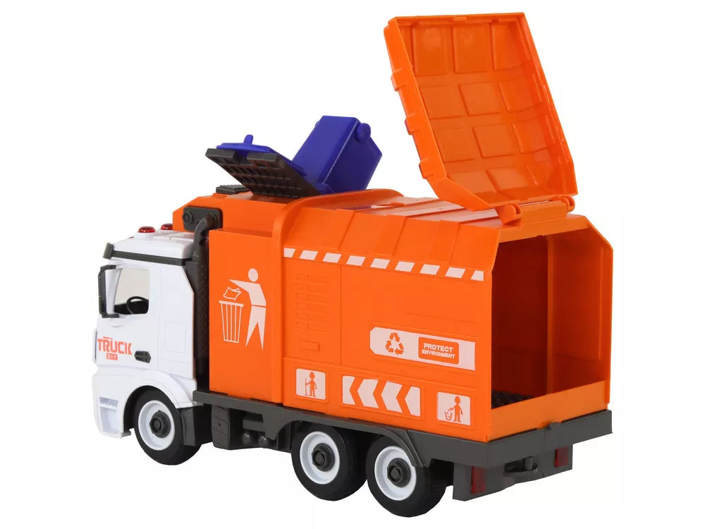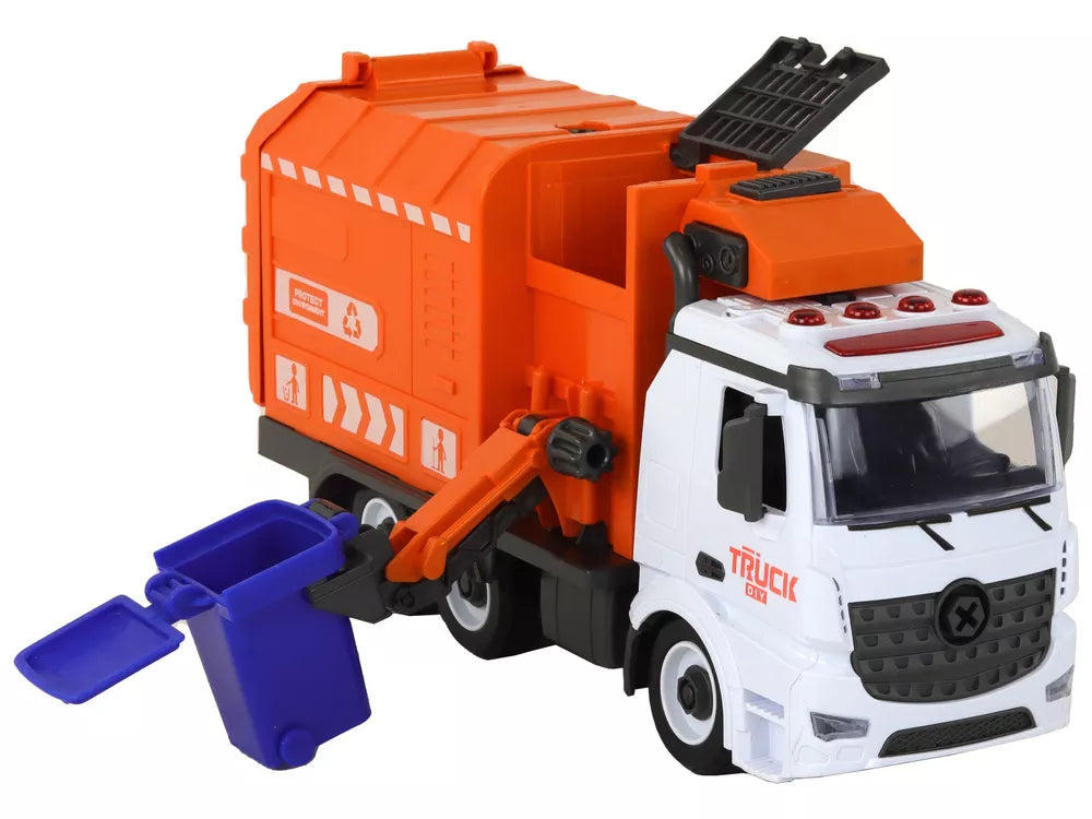 Šiukšliavežės transporto priemonė yra oranžinės ir baltos spalvos, tiksliai atkartojanti tikros šiukšliavežės išvaizdą. Rinkinyje yra įspūdinga šviesos ir garso sistema, kuri žaidžiant suteikia tikroviškumo.