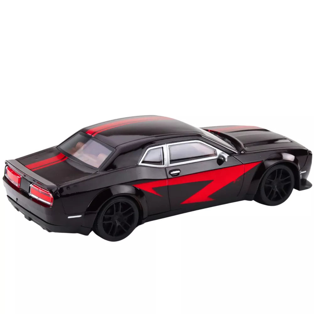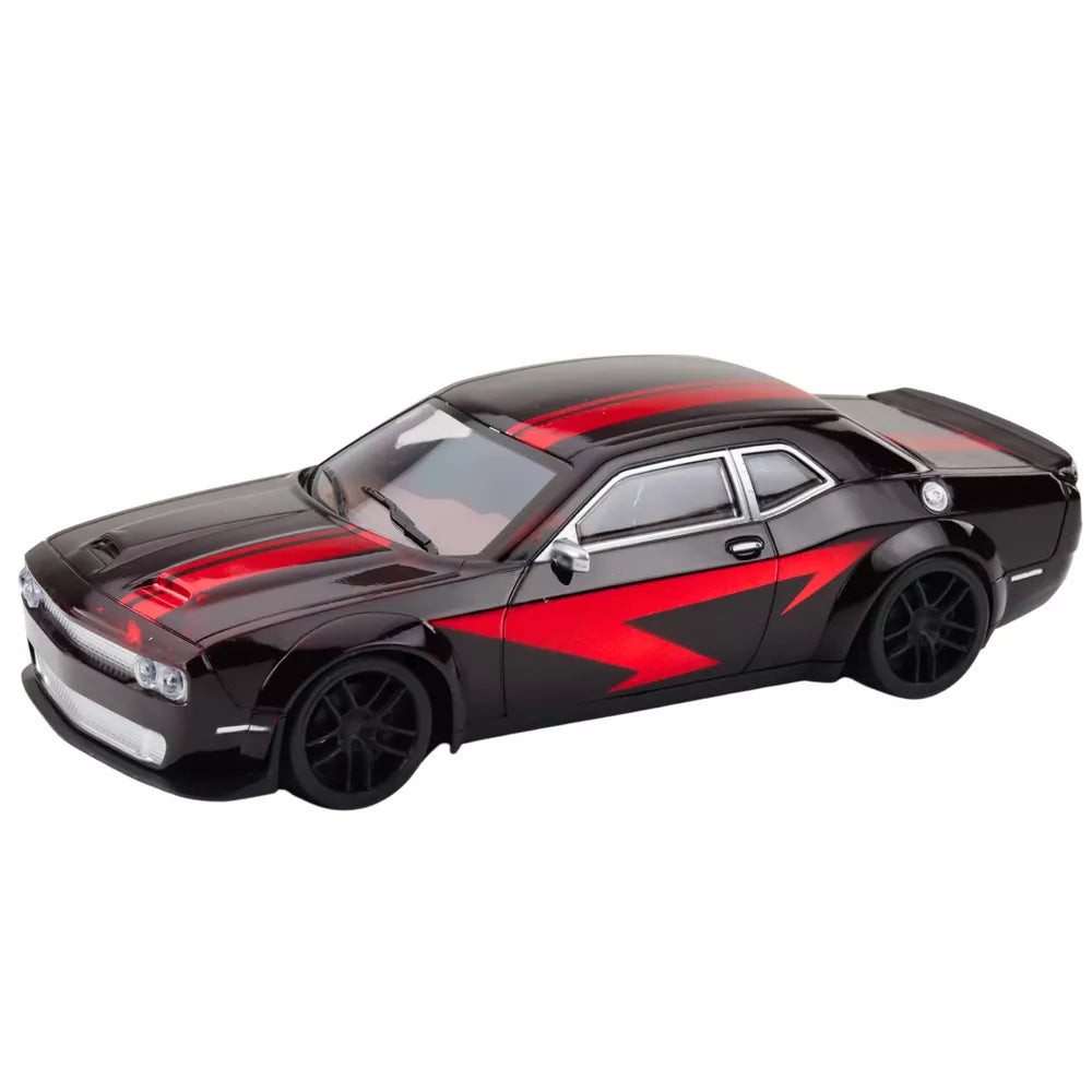 Sportinio automobilio važiavimas blizgančiu korpusu juodos spalvos raudonomis linijomis