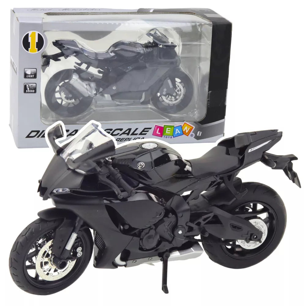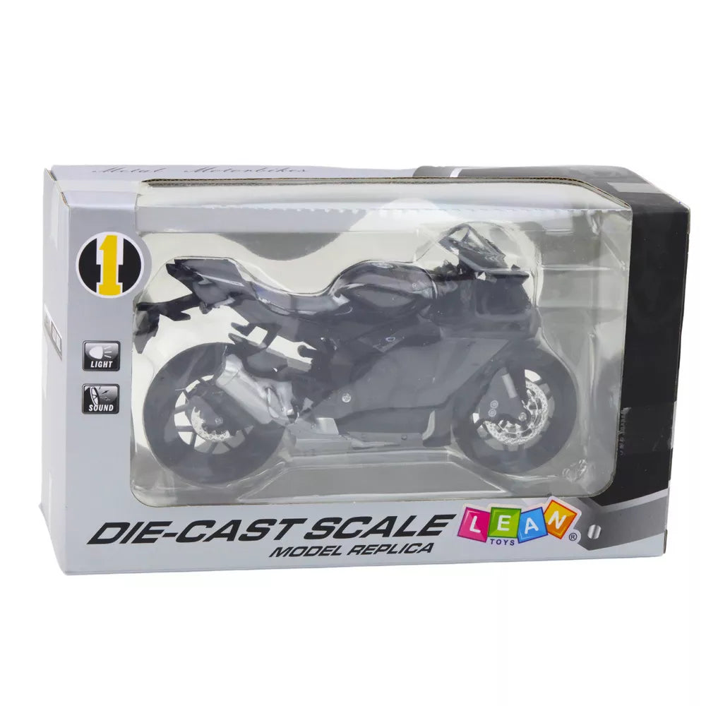 Modelis aprūpintas šviesos ir garso efektais, kurie aktyvuojami naudojant 3x AG13 maitinimo šaltinį (pridedamas). Papildomos funkcijos padidina žaidimo realistiškumą, todėl motociklas atrodo ir skamba kaip tikra transporto priemonė. Dinamiškas, sportiškas dizainas juodos spalvos įkvėptas klasikinių lenktyninių motociklų, o tai suteikia jam autentiškumo.