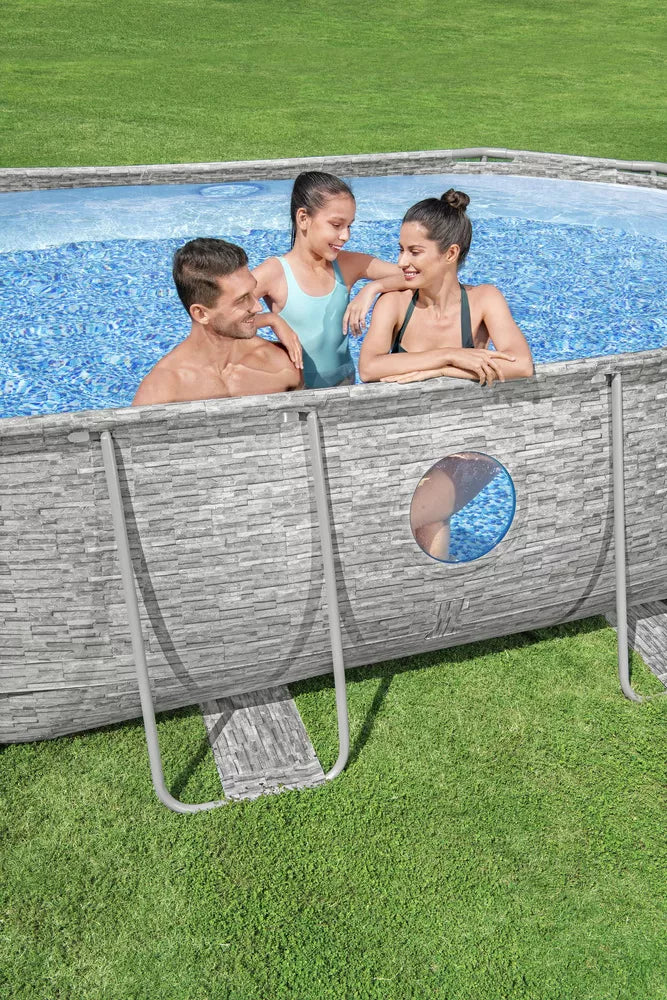 Bestway Power Steel Swim Vista serijos karkasinis baseinas yra tvirta ir moderni konstrukcija, kuri suteiks nepamirštamų atsipalaidavimo ir linksmybių akimirkų visai šeimai. Dėl novatoriškų technologinių sprendimų ir patrauklaus dizaino tai idealus pasirinkimas karštoms vasaros dienoms. Baseine sienose įmontuoti langai, leidžiantys stebėti povandeninį pasaulį ir tėvams geriau kontroliuoti jauniausiųjų linksmybes, didinant saugumą. Jį lengva surinkti, labai patvarus ir korozijai atsparus metalinis rėmas aprūpintas sistema, užtikrinančia tvirtą ir saugų rėmo elementų sujungimą. Pagamintas iš patvarios medžiagos, kuri yra sustiprinta, kad padidėtų stiprumas ir atsparumas pradūrimui. Baseinas taip pat aprūpintas filtro siurbliu, apsauginėmis kopėčiomis ir ChemConnect ™ chemikalų dozatoriumi. ChemConnect dozatorius palaiko švarų, sveiką baseino vandenį, užtikrindamas stabilų chloro lygį, kuris tolygiai paskirstomas visame baseine. Kopėčios užtikrins patogų įėjimą į baseiną, taip pat turi galimybę pakelti laiptelius aukštyn, todėl jums nereikės rūpintis jauniausių namų ūkio narių saugumu, nes jiems bus užkirstas kelias patekti į baseiną be suaugusiųjų priežiūros.