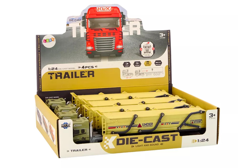 Priekabą galima atkabinti nuo traktoriaus, o tai leidžia įvairius žaidimo scenarijus. Transporto priemonė turi frikcinę pavarą, o tai reiškia, kad pajudėjus į priekį arba atgal, ji toliau judės dėl sukauptos energijos. Paspaudus sunkvežimio kabiną, suaktyvinami garso ir šviesos efektai, o tai suteikia realistiškumo ir padidina žaislo patrauklumą. Žaislas pagamintas iš vaikams saugių medžiagų, laikantis saugos standartų. Pagamintas atitinkamu 1:24 masteliu, kuris leidžia laisvai žaisti namuose ir lauke.