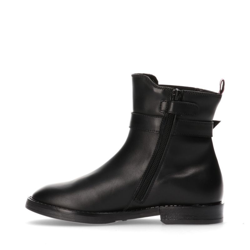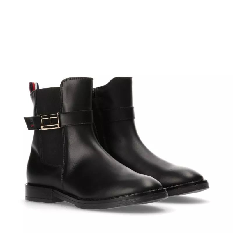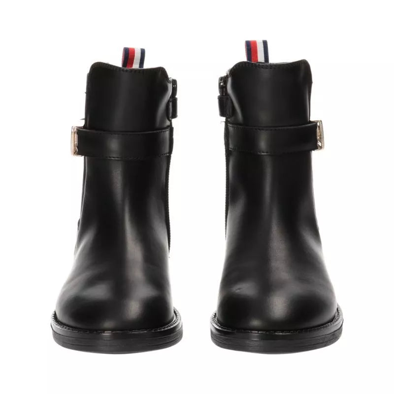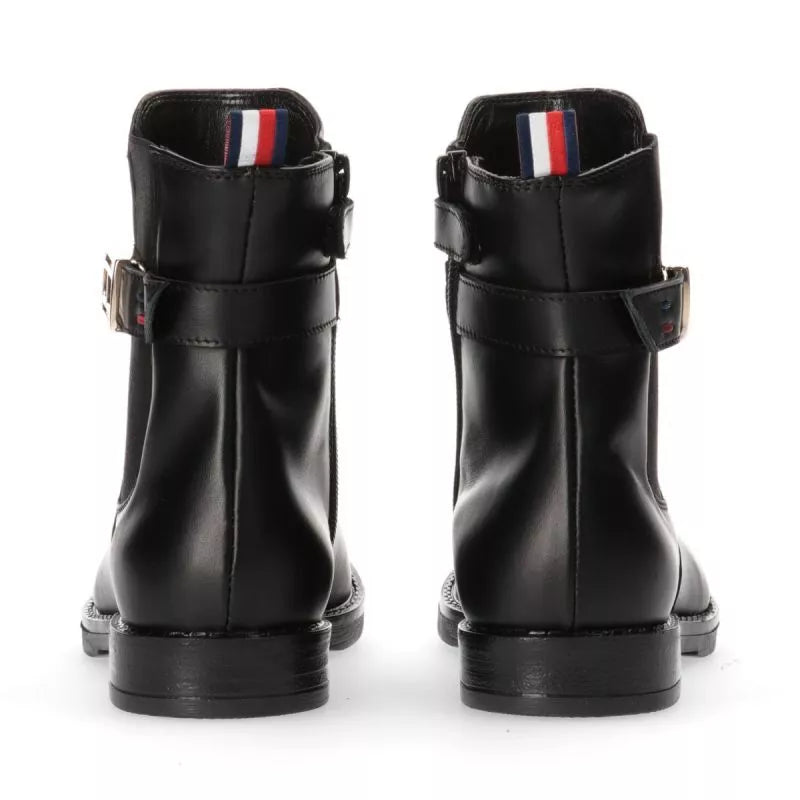 Tommy Hilfiger ankle batai, modelis T4A5-32022-0283999, juodos spalvos. Viršutinė dalis pagaminta iš lygios natūralios odos ir tekstilės derinio. Kulnas sutvirtintas, o aplink kulkšnį yra dekoratyvinė sagtis, puošta prekės ženklo vėliavos formos logotipu. Šoniniai užtrauktukai leidžia juos lengvai užsidėti ir nusivilkti. Šie patogūs ankle batai puikiai tinka rudeniui ir ankstyvai žiemai.