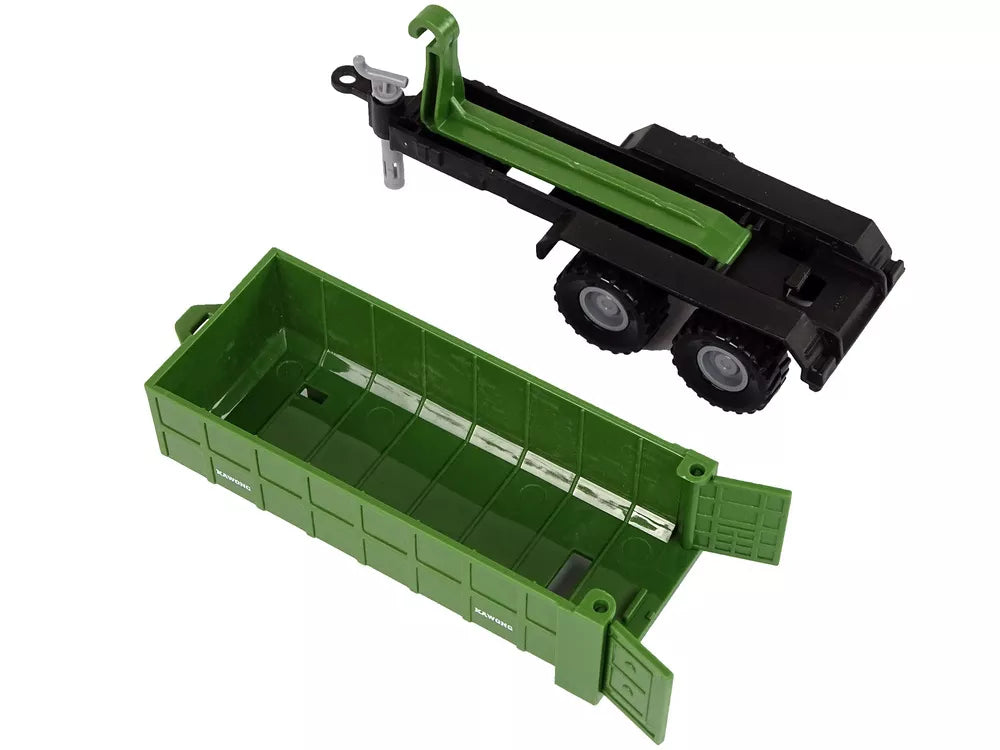 Traktorius su nuimama žemės ūkio priekaba, skleidžiantis garsus, žalias