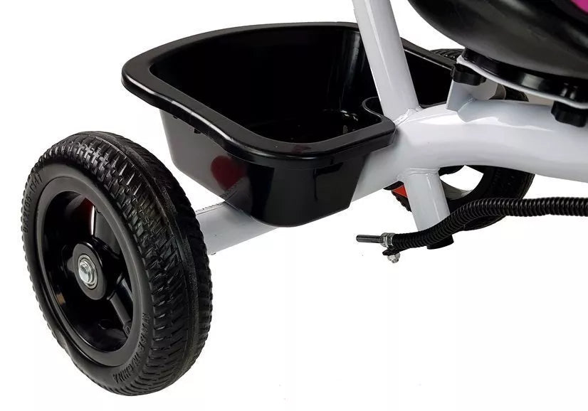 Dviračio konstrukcijoje yra talpus krepšys apsipirkimui ar kūdikio lobių laikymui, esantis tarp galinių ratų, ir mažas užtrauktuku užsegamas krepšys ant kreiptuvo tėvams – šios detalės palengvina visos dienos pasivažinėjimus ir keliones. Minkštas putų poliuretano turėklas užtikrins visišką jūsų vaiko saugumą pasivaikščiojimų metu ir neleis iškristi iš balnelio. Ant vairo taip pat yra trimito varpelis, kuriuo jūsų vaikas galės drąsiai pranešti kitiems, kad važiuoja. Triratis dviratis vaikams skirtas visiems kūdikiams nuo 6 iki 60 mėnesių, kurių svoris neviršija 25 kg. Jis pagamintas iš patvarios ir atsparios medžiagos, kuri garantuoja ilgą tarnavimo laiką ir naudojimo komfortą. Dviratis turi minkštus EVA ratus. Triratis vaikams supakuotas į originalią kartoninę dėžę, kurios viduje yra varžtai, įrankiai ir instrukcijos, palengvinančios savarankišką surinkimą.