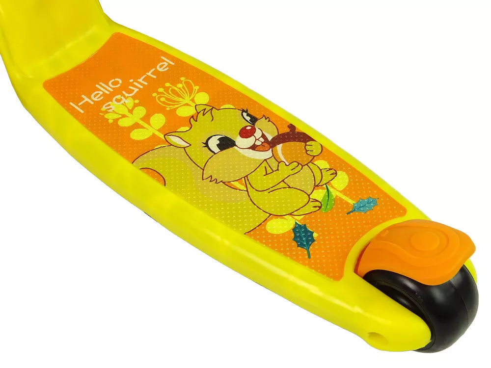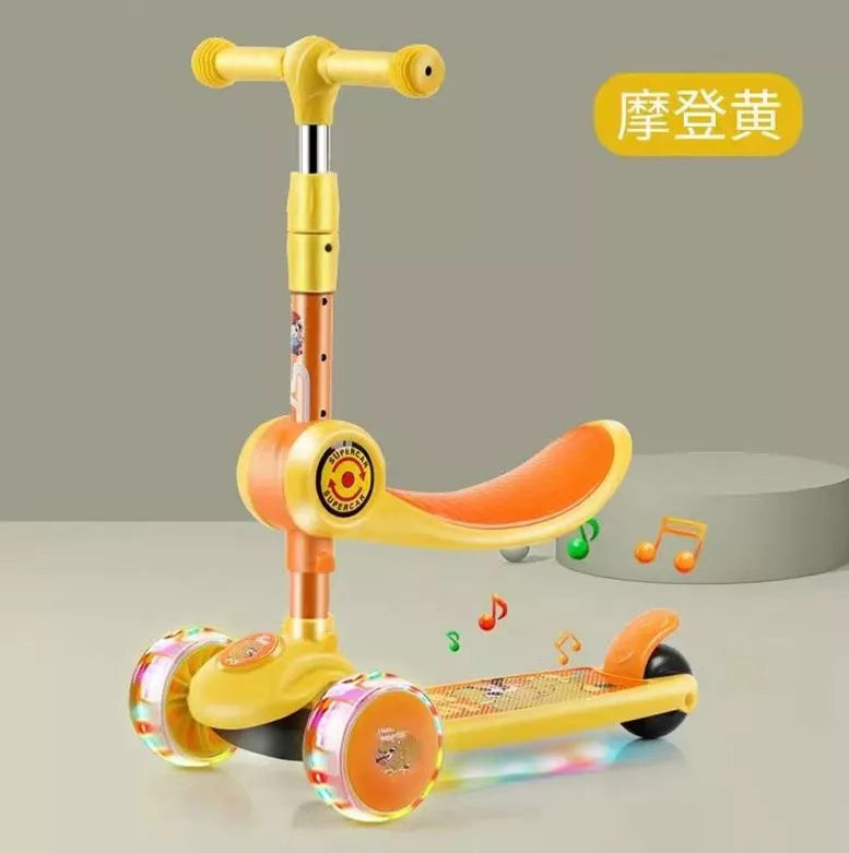 Trijų ratų balansinis paspirtukas su sėdyne, geltonas, su muzika ir diodais Voveraitė