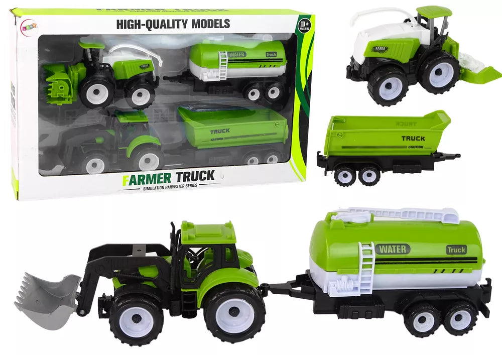 Rinkinį sudaro traktorius, kombainas ir dvi priekabos su skirtingomis funkcijomis – vandens cisternos, skirtos vandeniui transportuoti, ir puspriekabė grūdams transportuoti. Transporto priemonės aprūpintos judančiais elementais, kurie papildomai pabrėžia jų realistiškumą ir leidžia vaikui geriau suprasti žemės ūkio technikos veikimą. Tai ne tik puiki pramoga, bet ir galimybė įgyti žinių apie žemės ūkio funkcionavimą. Kiekvienas rinkinys siūlo skirtingas žaidimo galimybes ir leidžia žaisti įvairius vaidmenis, susijusius su darbu ūkyje.
