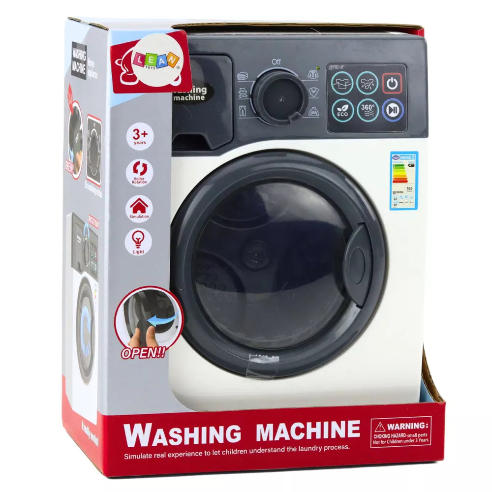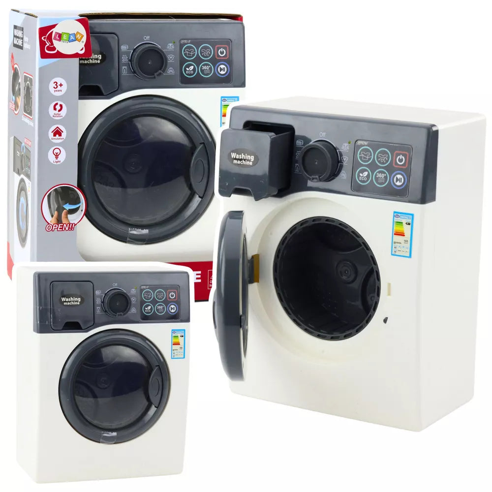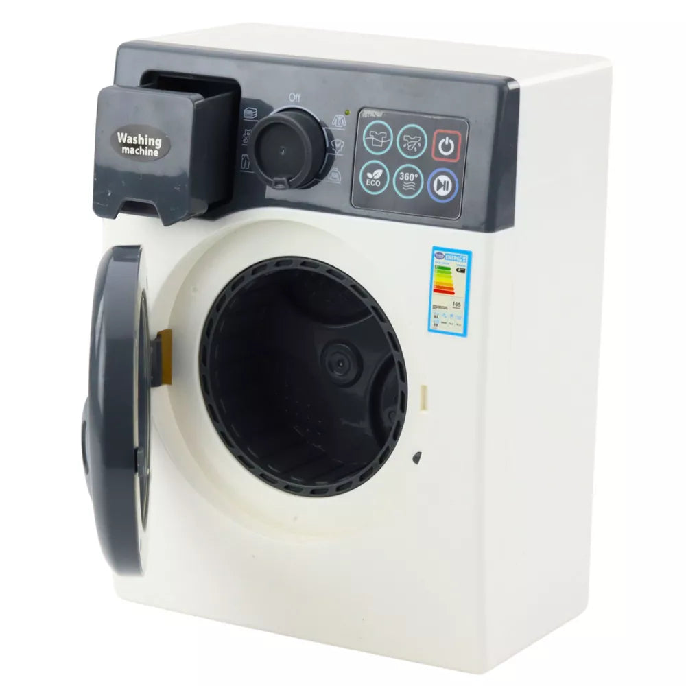 Vaikiška skalbimo mašinėlė su sensoriniu skydeliu, besisukančiu būgnu, šviesiai balta