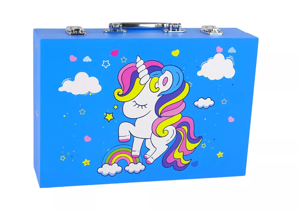 Puikus piešimo rinkinys, kuris nudžiugins kiekvieną mažąjį menininką! Jame yra visi reikalingi priedai gražiems darbams kurti: kreidelės, flomasteriai, dažai ir kiti priedai. Viskas supakuota į patogų lagaminą su žaviu vienaragio paveikslėliu. Šio rinkinio dėka jūsų vaikas galės lavinti savo vaizduotę ir kūrybinius įgūdžius, taip pat visur su savimi pasiimti savo reikmenis.