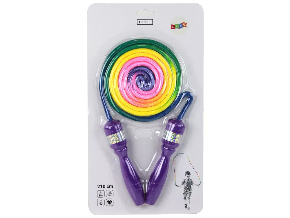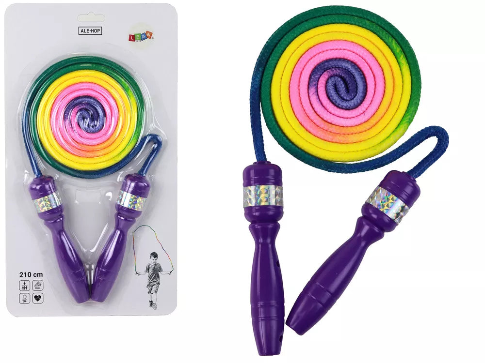 Siūlome jums nepaprastą vaivorykštinių spalvų šokdynę su violetinėmis rankenomis. Šokdynė, nors ir vienas paprasčiausių žaislų, dešimtmečius išlaiko savo populiarumą, džiugindama tiek vaikus, tiek tėvelius.