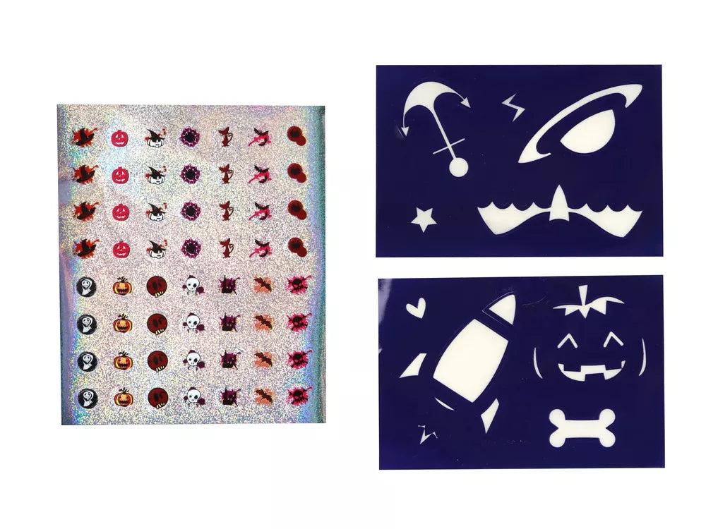 Du blizgučių geliai aukso ir tamsiai mėlynos spalvos atspalviais suteikia įspūdingo blizgesio ir suteikia unikalų charakterį nupieštiems raštams. Lipnus trafaretas yra puikus įrankis, padedantis lengvai sukurti sudėtingus raštus.