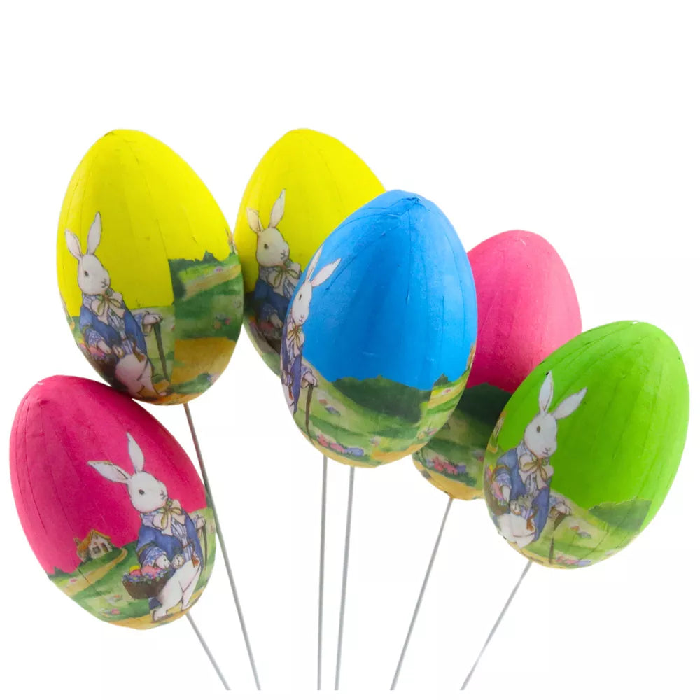 Velykiniai kiaušiniai ant vielos, dekoratyvinė šakelė su zuikučiu ir krepšeliu, 6 vnt.