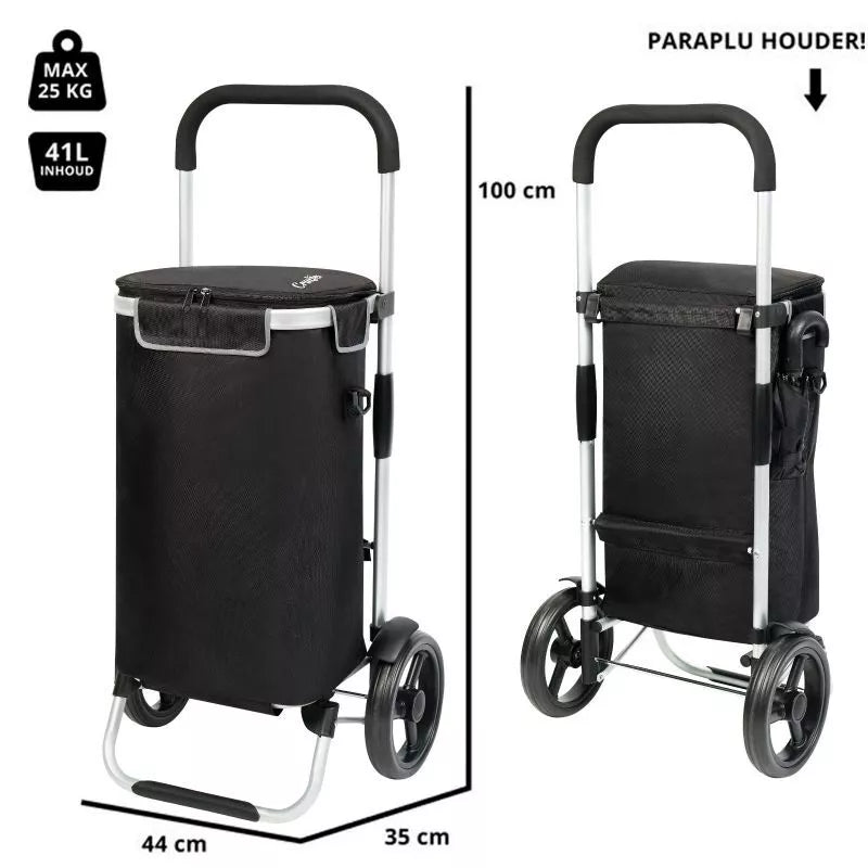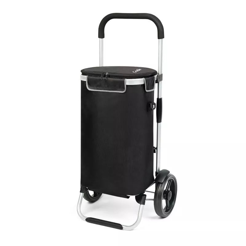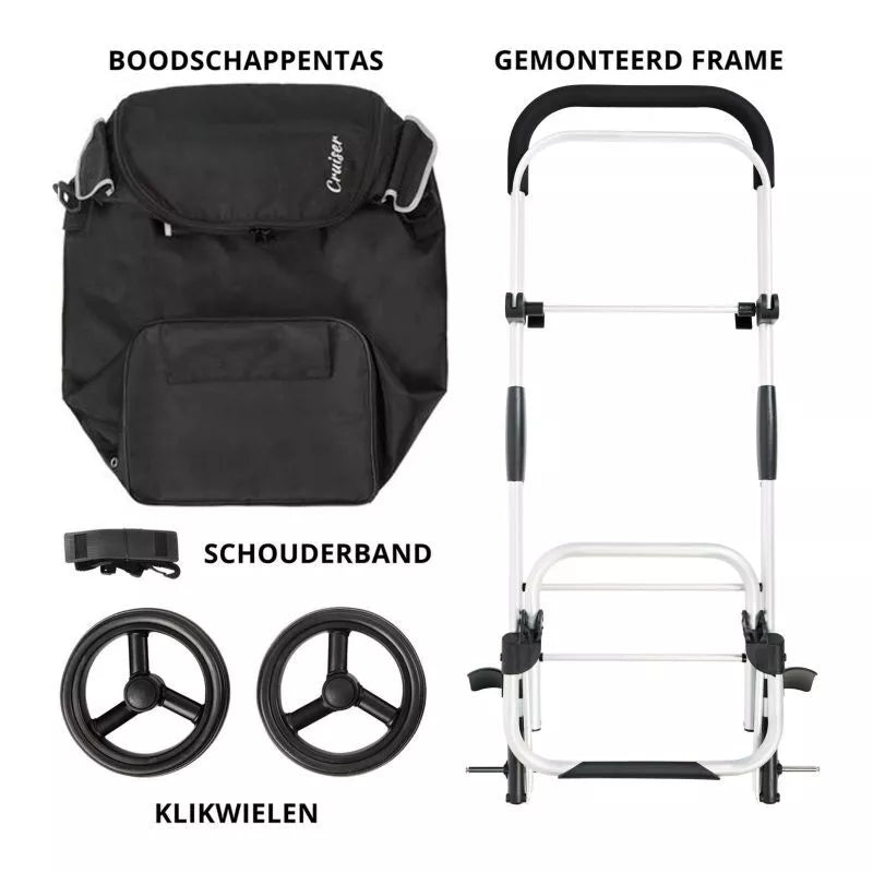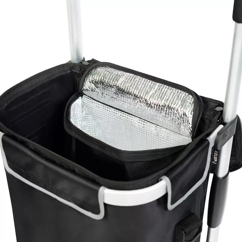 Cruiser Allround vežimėlis turi 60 litrų talpą. Jame galite lengvai sutalpinti iki 25 kg maisto produktų. Jame taip pat yra papildomas 4 litrų termo maišelis. Tai leidžia apsipirkti ilgesnį laiką, net ir vasarą, nesijaudinant, kad jūsų daiktai aukštoje temperatūroje praras savo savybes. Vežimėlį galite atsegti nuo aliuminio rėmo ir naudoti kaip klasikinę petnešėlę. Petnešėlė yra pridedama.