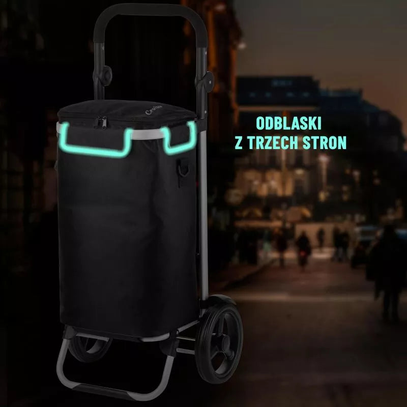 Viršuje ant vežimėlio yra atšvaitinės detalės, užtikrinančios geresnį matomumą grįžtant su pirkiniais sutemus.