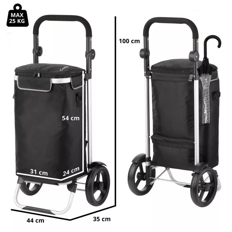 Cruiser vežimėlis tuščias sveria 3,5 kg. Jis pagamintas iš vandeniui atsparaus, patvaraus nailono ir poliesterio, turi aliuminio rėmą. Šis produktas yra absoliučiai tobulas visiems. Jis puikiai tinka senjorams kasdieniniams pirkiniams, tėvams, taupantiems atsargas, ir nėščiosioms, kurios nenori nešti nieko sunkaus. Jei turite sąnarių problemų, buvote operuoti arba patyrėte traumą, vežimėlis palengvins kasdienes keliones. Jis taip pat naudingas visiems, kurie mėgsta sveiką gyvenimo būdą ar dažnai lankosi turguose. Įkeldami pirkinius tiesiai į vežimėlį, jūs atsisakote plastikinių maišelių, taip tausodami aplinką. Taip pat sutaupote laiko ir nereikia persikrauti daiktų.