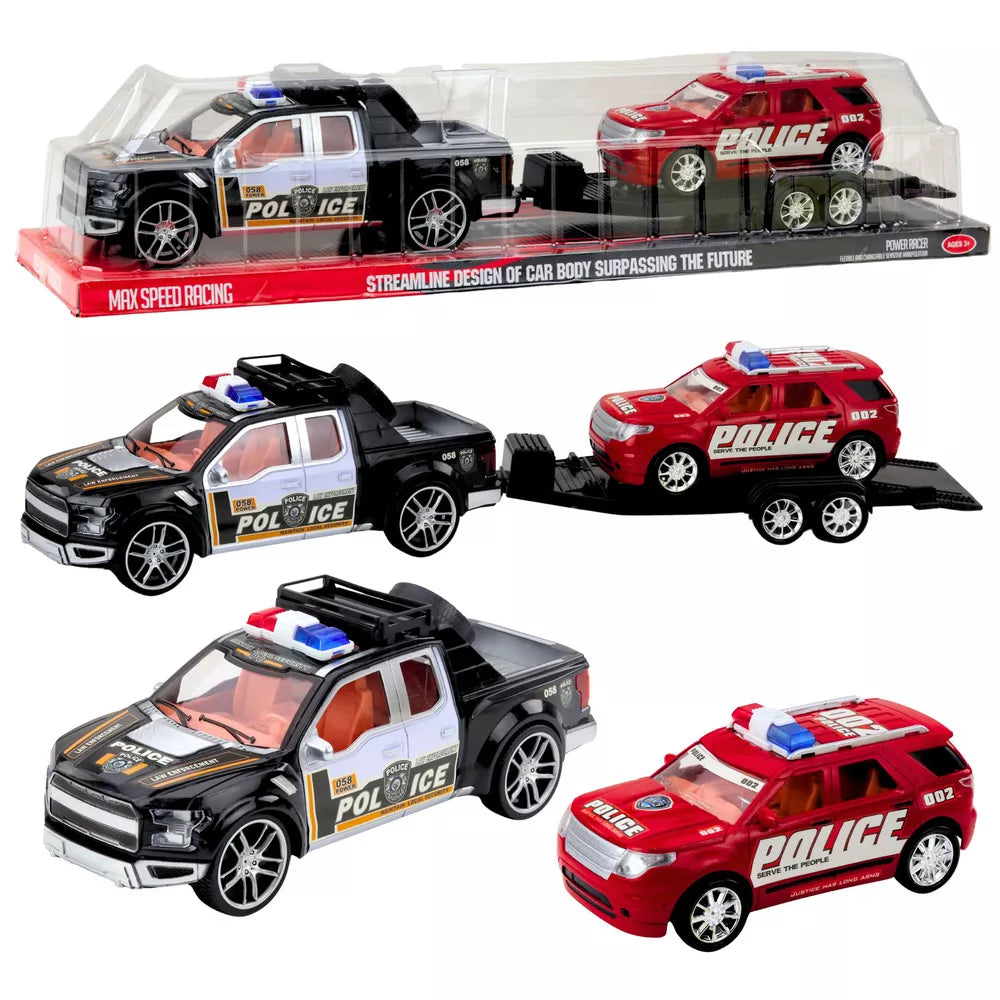 Šis policijos vilkiko rinkinys puikiai tinka vaikams, kurie mėgsta dinamiškus žaidimus ir žavisi teisėsaugos pasauliu. Rinkinį sudaro galingas juodas visureigis su vilkimo priekaba ir raudonas policijos automobilis. Šis rinkinys leidžia kurti realistiškus gaudynių, transportavimo ir specialių operacijų scenarijus, lavinant vaiko vaizduotę ir kūrybiškumą.