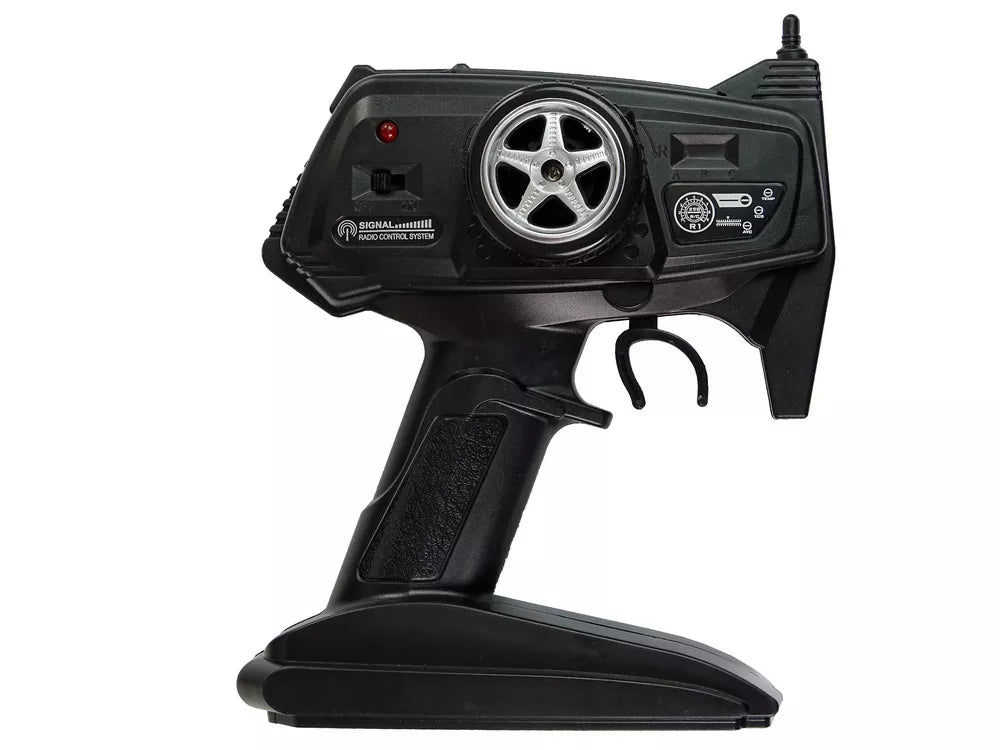 Komplekte yra patogus ir tikslus valdiklis. Jei kada nors esate valdę profesionalų automobilį, žinote, kad šio tipo nuotolinio valdymo pultas leidžia gauti maksimalų malonumą iš vairavimo. Belaidis nuotolinio valdymo pultas, esantis rinkinyje, veikia 2,4 GHz dažniu, todėl galite lenktyniauti didesnėje grupėje, nesijaudindami dėl trukdžių vienas kitam. Galimybė vairuoti visomis kryptimis leidžia tyrinėti naujus maršrutus. Papildomas privalumas yra galimybė įlipti 45 laipsnių kampu, todėl knygų krūva nėra kliūtis.