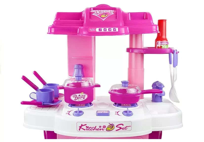 Pristatomą virtuvėlę sudaro įspūdingas 22 elementų skaičius, labai svarbus kiekvienos virtuvės įrangai. Žaislinėje viryklėje yra du apšviesti degikliai su nepriklausomais jungikliais. Juos aktyvinus vaikas išgirs garsą, panašų į maisto gaminimo patiekalą. Kitas privalumas, turint virtuvės komplektą mažajam pagalbininkui, yra į orkaitę integruotas įjungimo/išjungimo jungiklis, t. y. laikmatis. Kai jūsų vaikas jį įjungs, jis išgirs būdingą orkaitės garsą, o viduje esanti lemputė užsidegs. Pasibaigus laikui, virtuvėlė išsijungs.