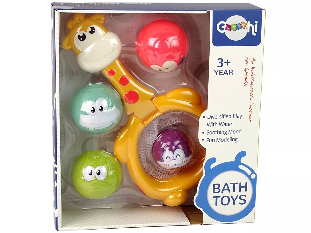 Keturiuose kamuoliukuose yra mažos skylutės, į kurias patenka vanduo, kai žaislas yra paspaudžiamas, vanduo juokingai iššoka, o tai tikrai pradžiugins jūsų vaiką. Kamuoliukai yra panašūs į mažus gyvūnus: krokodilą, hipopotamą, žuvį, beždžionę. Į vonios rinkinį įtraukti gyvūnai pagaminti iš sertifikuotų medžiagų, kurios yra nekenksmingos vaikui.