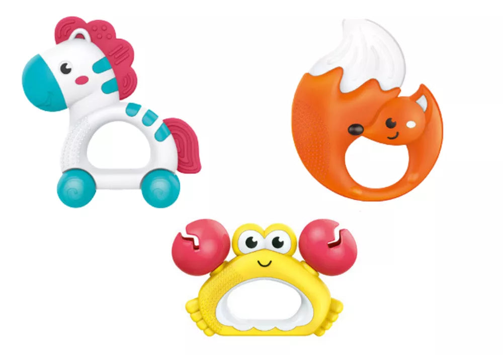 Žaislai turi barškančių elementų, kurie purtant skleidžia garsus, o tai padeda lavinti vaiko klausą, smalsumą ir motorinius įgūdžius. Be to, žaislai aprūpinti guminiais elementais, kurie atlieka kramtukų funkciją. Šios saugios, minkštos detalės puikiai tinka kramtymui ir palengvina dygimo procesą.