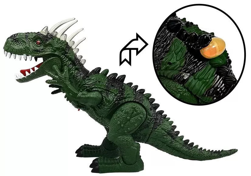 Tyrannosaurus Rex ant galvos turi didelius žvynus, kurie šviečia įvairiomis spalvomis. Privalumas taip pat yra didelė kaukolė, taip pat masyvi, raumeninga kūno sudėjimas, didžiuliai sniego baltumo dantys. Žalia spalva derinama su juodais elementais ir visais priedais, žvynais, ilgais nagais leidžia mums pajusti, kad dinozauras yra tikras! Dinozauras juda į priekį, judina galvą, viršutines galūnes, atidaro ir uždaro burną, skleidžia riaumojantį garsą ir judina liemenį į kairę ir į dešinę. Kiaušinių dėjimas yra dar vienas jo privalumas! Į rinkinį įeina 3 vienetai, įmeskite juos per skylę nugaroje ir stebėkite, kaip kiaušiniai dedami iš apačios judant. Įjungus roplį, rodoma tikrojo tiranozauro nuotrauka, projektorius patalpintas ant narvo. Galime sužinoti tikro dinozauro išvaizdos paslaptį. Tai tikras nuotykis jūsų vaikui.