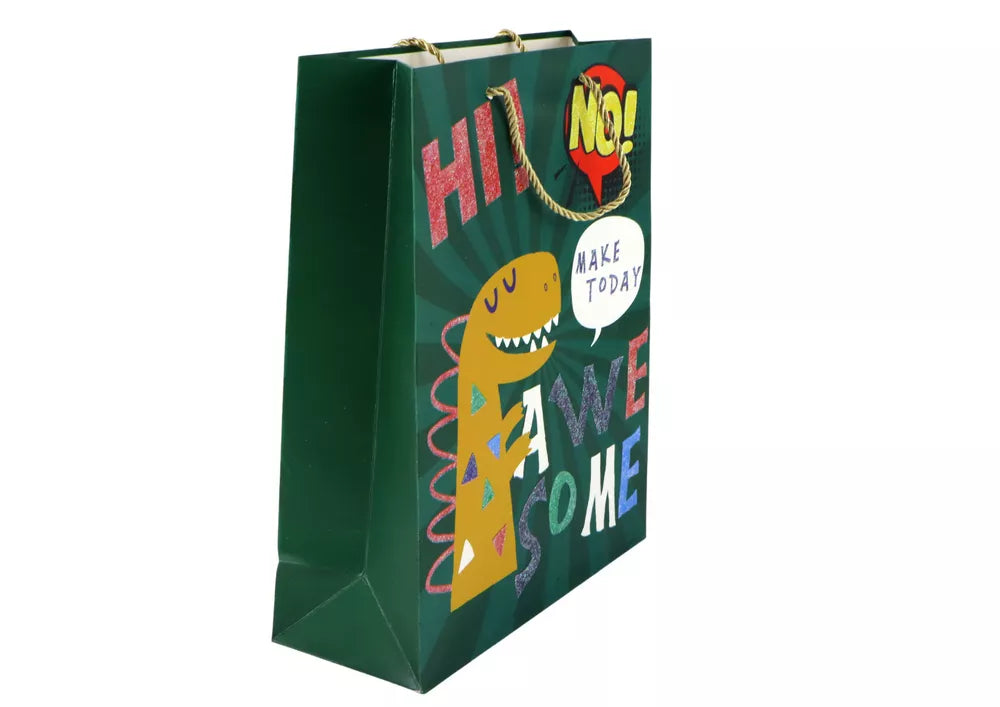 Žalias dinozauro popierinis dovanų maišelis, 41,5 cm x 30 cm x 12 cm