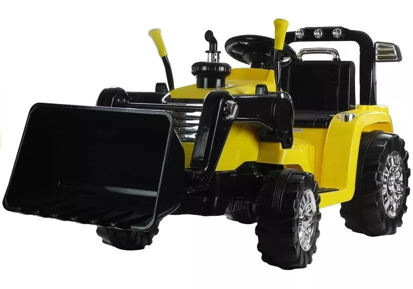 Šis traktorius skirtas vaikams, jis yra gražios ryškiai geltonos spalvos ir imituoja tikrą traktorių. Viduje rasite juodą sėdynę, kurios matmenys 25 cm x 18 cm. Išorėje – kasimo rankena, 37,5 cm pločio, valdoma rankiniu būdu dviem pavaromis, taip pat žaibo imitacija. Visa transporto priemonė dekoruota tipiniais žemės ūkio ir statybos mašinų įspėjamaisiais lipdukais ir etiketėmis. Traktoriaus viduje yra sukamasis vairas su garsiniu signalu ir mygtukas, skirtas įjungti energingas melodijas, kitas mygtukas START/STOP, variklio garso reguliatorius, pavara, skirta pakeisti važiavimo kryptį (pirmyn, atgal, sustoti) ir greičio pedalas, LED lemputės ir mini lizdo įvestis, leidžianti prijungti MP3 grotuvą.