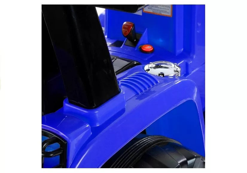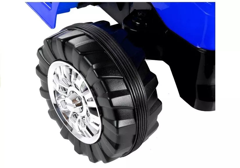 Šis traktorius sukurtas vaikams, jis yra gražios mėlynos spalvos ir imituoja tikrą traktorių. Viduje rasite juodą sėdynę, kurios matmenys 25 cm x 18 cm. Išorėje yra 37,5 cm pločio kasimo rankena, valdoma rankiniu būdu dviem pavaromis, taip pat žaibo imitacija. Visa transporto priemonė yra dekoruota žemės ūkio ir statybos mašinoms būdingais įspėjamaisiais lipdukais ir etiketėmis. Traktoriaus viduje yra besisukantis vairas su garsiniu signalu ir mygtukas energingoms melodijoms įjungti, kitas mygtukas START/STOP, variklio garso reguliatorius, pavara važiavimo krypčiai keisti (pirmyn, atgal, sustabdyti) ir greičio pedalas, LED lemputės ir mini jack įvestis, leidžianti prijungti MP3.