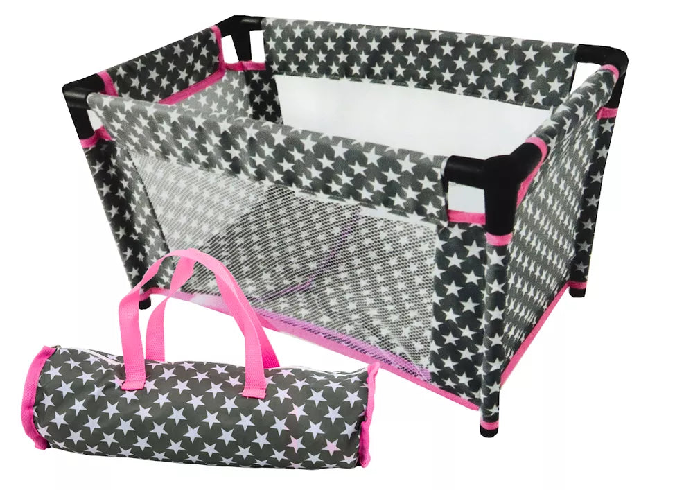 Dabar jūsų mažylės lėlė turi savo kampelį ir vietą, kur jos lėlė gali miegoti. Dėl tinklinių lovos kraštų ji gali stebėti, kas vyksta su lėle, ir atidžiai ją stebėti. Rėmas pagamintas iš aliuminio vamzdžių su juodomis plastikinėmis jungtimis. Į komplektą įeina antklodė ir pagalvė. Visa lova ir elementai yra pilkos spalvos su baltomis žvaigždėmis ir rožiniais elementais. Ją galima lengvai išardyti ir laikyti nešiojamame krepšyje, todėl visada galite ją pasiimti su savimi.